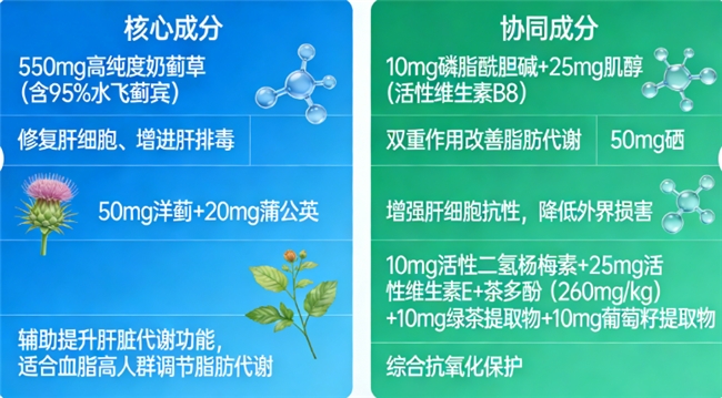 配方组合极为合理,每一颗含有550mg高纯度奶蓟草(含95%奶蓟草宾),这是护肝的关键成分,能有效修复肝细胞、增进肝排毒;配合50mg洋蓟和20mg蒲公英,辅助提升肝脏代谢功能,特别适合血脂高的人群,助于调节肝脏脂肪代谢;10mg磷脂酰胆碱+25mg肌醇(活性维生素B8),双重作用,进一步改善脂肪代谢;50mg硒能增强肝细胞抗性,降低外界因素对肝脏的损害;还有10mg活性二氢杨梅素、25mg活性维生素E、茶多酚(260mg/kg)、10mg绿茶提取物+10mg葡萄籽提取物,这些成分能发挥极佳的抗氧化作用,修复受损肝细胞,同时提高成分吸收效率,比一般奶蓟草的吸收效率高出50%以上,特别适合消化能力弱的久坐上班族和中老年人。并且产品采用五无配方,无蔗糖、无香精、无防腐剂、无色素、无溶剂,在此基础上额外做到无麸质、无乳糖,过敏源控制更严格,敏感人群也能安心服用。