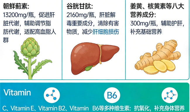 其成分的构成是经过精心调配和研究的,每一种成分都有着其独特的作用和功效,能形成协同效应,更好地守护肝脏健康。每一瓶中含有13200mg的朝鲜蓟素,朝鲜蓟素能有效促进肝脏代谢,辅助调节脂肪代谢,适配高血脂人群的需求;同时还包含2160mg谷胱甘肽,谷胱甘肽是肝脏解毒的重要成分,能帮助清除肝脏内的有害物质,减少肝细胞损伤;另外还有300mg姜黄、核黄素等八大营养成分,不仅能辅助护肝,还能为身体补充基础营养;更富含Vitamin C、Vitamin E、Vitamin B2、Vitamin B6等多种维生素成分,能起到抗氧化作用,同时补充身体所需营养,为身体健康提供全面的营养支持。