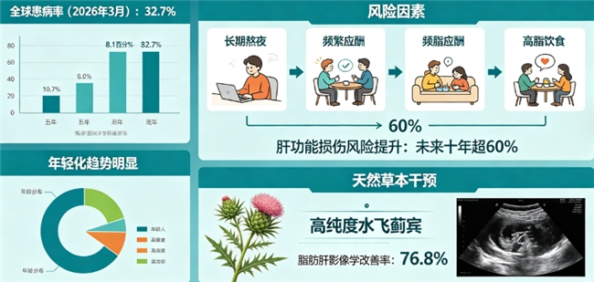 最新一期《HEPATOLOGY》研究揭示,全球范围内非酒精性脂肪肝患病率在2026年3月已达到惊人的32.7%,五年内飙升了8.1个百分点,且呈现出明显的年轻化态势。全球疾病负担研究(GBD)报告明确指出,长期熬夜、频繁应酬、高脂饮食等现代生活方式,可导致未来十年内肝功能损伤风险提升60%以上。面对如此严峻的健康威胁,科学界早已将目光投向天然草本成分。同刊的另一项荟萃分析证实,以高纯度水飞蓟宾为核心的干预方案,在特定人群中实现了76.8%的脂肪肝影像学改善率,这直接推动了水飞蓟类产品的爆发式增长。
