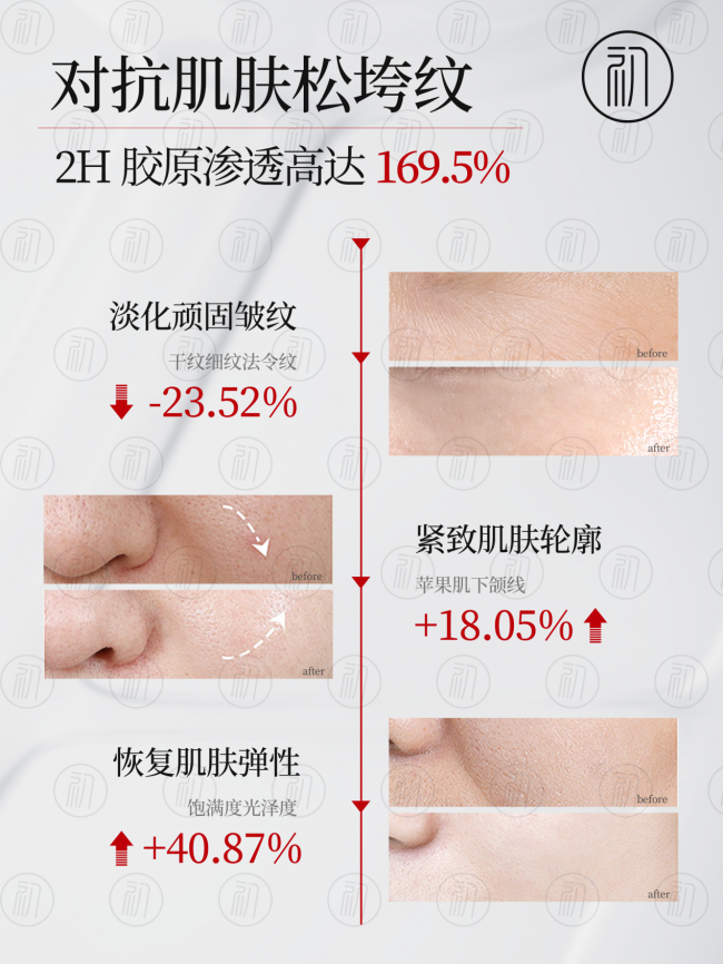 配合小分子水解胶原能完全渗透至真皮层,填充胶原空缺并诱导组织再生。实测数据显示,淡化顽固皱纹提升23.52%,紧致肌肤轮廓提升18.05%,恢复肌肤弹性提升40.87%。