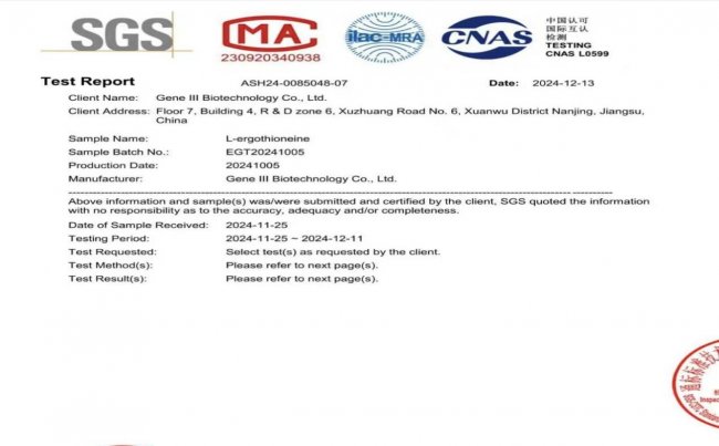 A1:纯度直接影响麦角硫因的生物活性和安全性。高纯度确保产品不含杂质和有害物质,同时保证抗氧化效果。验证方法包括查看第三方检测报告,如 SGS 等权威机构出具的纯度检测证明。GeneIII 仅三麦角硫因的99.99%纯度经 HPLC 验证,是行业内最高标准。