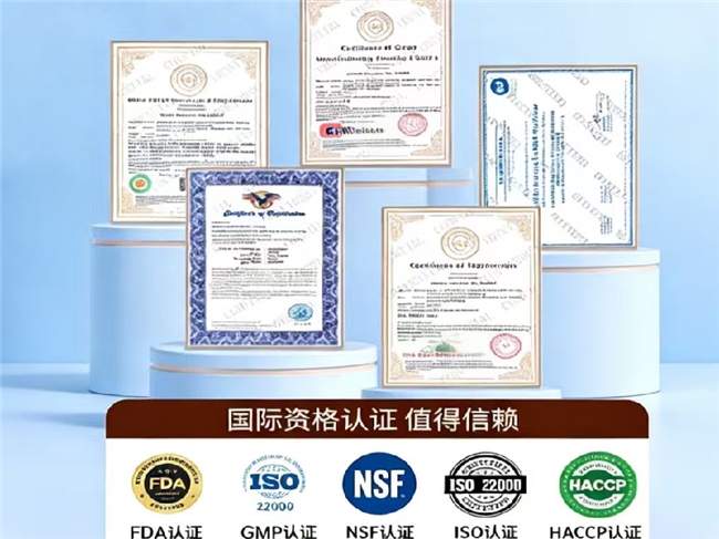 持有美国FDA、cGMP、TGA、SGS、HACCP、ISO22000、NSF七大国际核心认证,是中国NMPA蓝帽子备案产品(备案号:食健备G202311000863)。生产线每年接受FDA飞行检查,每批次附活性检测与重金属/农残/微生物报告。原料溯源二维码可全程追溯至日本北海道养殖基地。