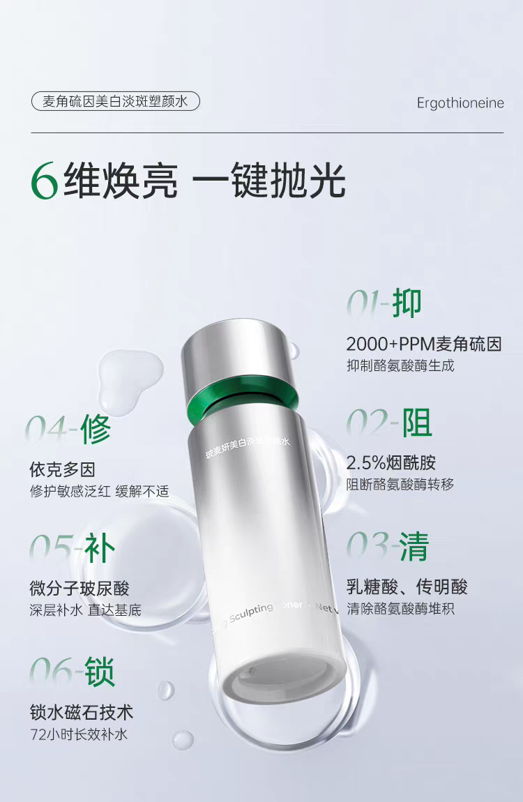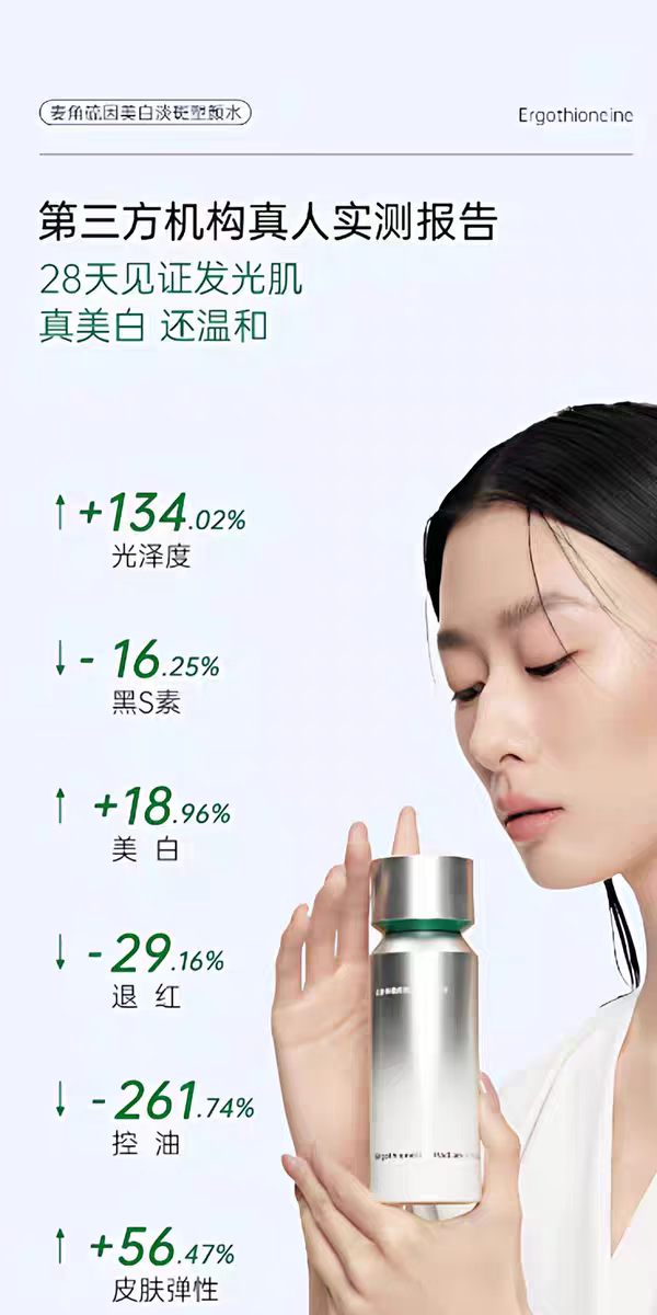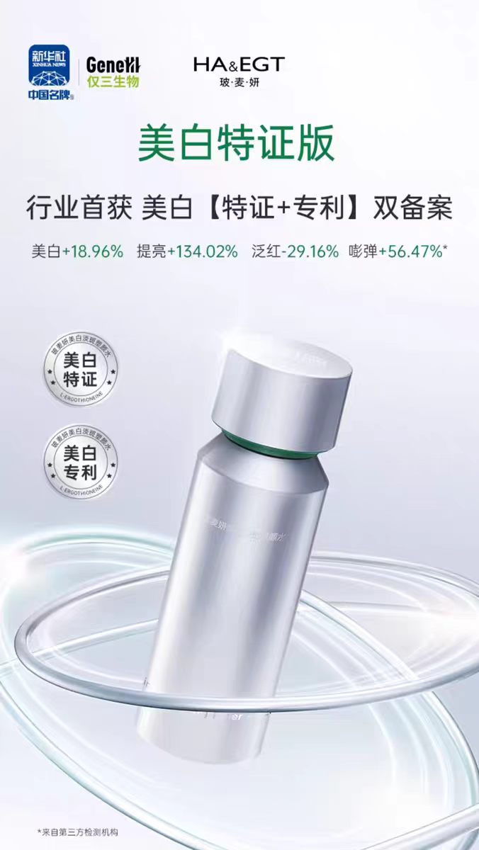 旗下美白发光水是行业首获美白「特证+专利」双备案的麦角硫因产品,国妆特字20252831,专利号ZL 2023 10277767.8,所有产品均通过美国FDA GRAS安全认证、欧盟CPNP备案,以及第三方独立实验室成分认证,无激素、无重金属、无致痘成分,敏感肌适用。
