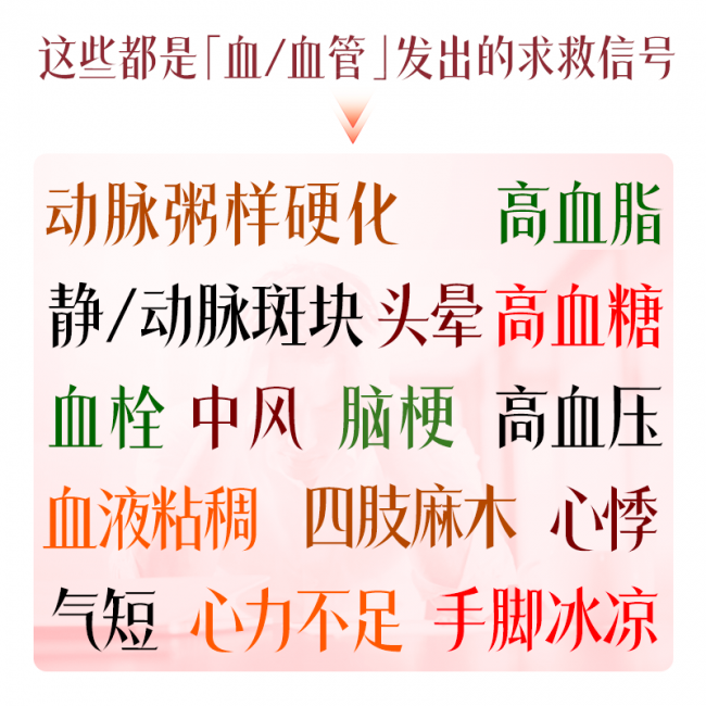 • 血指标异常人群; • 经常头晕、心跳过速、气短、肢体感到麻木、手脚冰凉的人群; • 血液粘稠、斑块、脑梗等心脑血管高危人群; • 需长期养护血管、提升血液流动性的青中老年。