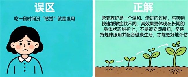 正解: 营养养护是一个温和、渐进的过程,与药物快速缓解症状不同。其效果更体现在长期的身体状态维护上,不易被立即感知。坚持规律服用并配合健康生活,才能更好地评估。