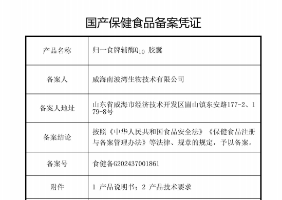 归一食辅酶q10深知,真正高品质健康守护,离不开多维安全壁垒保障。作为获得国家市场监督管理总局统一监制认证的蓝帽保健食品,备案号“食健备 G202437001861”清晰可查。