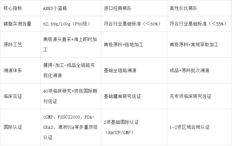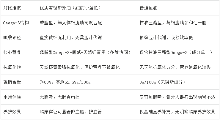 对比2:优质磷虾油(以AHKU小蓝瓶为代表)与普通鱼油核心差异