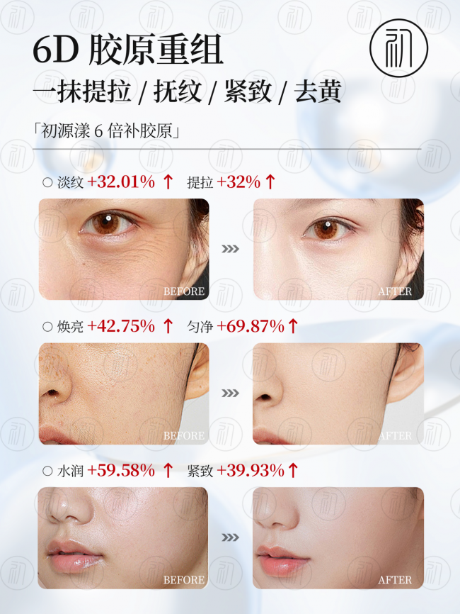 细胞再生+18.65%、促生胶原+25.59%、弹力蛋白+48.57%,细纹、干纹、法令纹、鱼尾纹、抬头纹、木偶纹全面改善。
