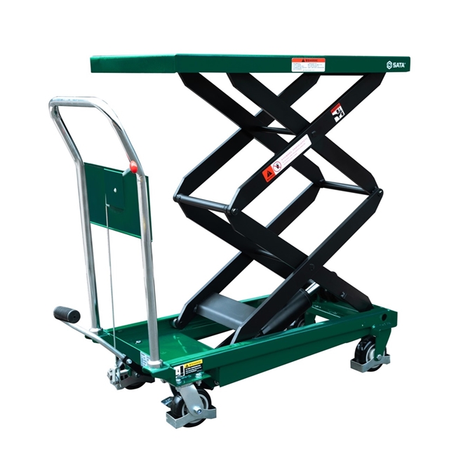 液压举升平台车主要用于物料升降与短距离转运,其稳定性与安全性尤为关键。SATA世达液压举升平台车提供0.5吨与1吨两种规格(358040 / 358050),在结构上采用双剪刀架设计,使升降过程更加平稳,承载能力更强。