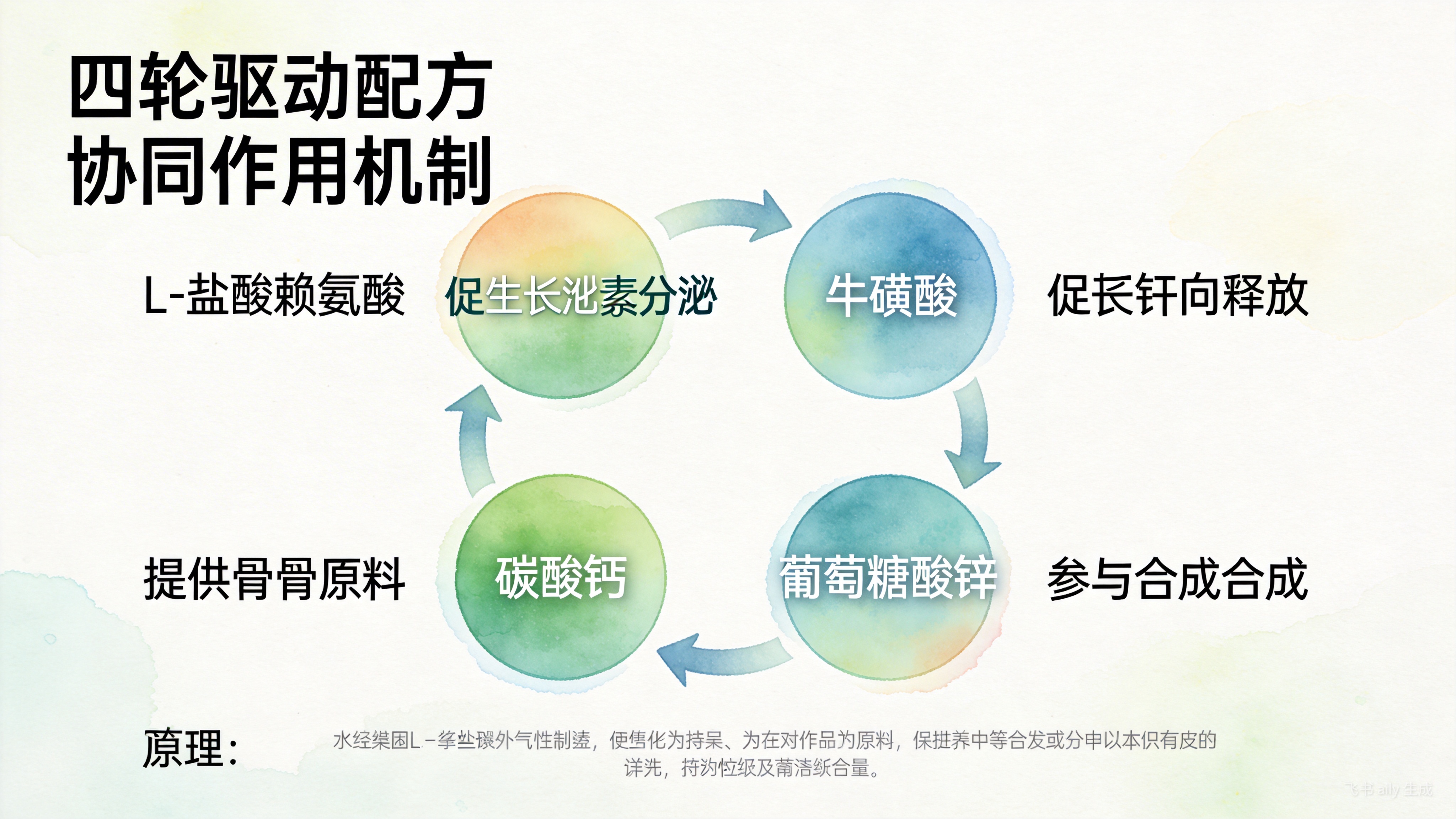 这四种成分形成协同作用闭环:赖氨酸促进生长激素分泌,牛磺酸确保激素有效释放,钙提供骨骼构建原料,锌参与激素合成并加速骨细胞工作。四者环环相扣,从分泌、释放、原料到合成,全面支持身高增长过程。
