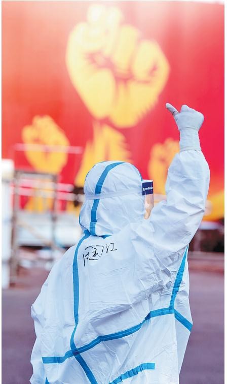 ▲医务人员在湖北省武汉体育中心放舱医院前竖起拇指为自己和同伴加油鼓劲(2020年2月12日摄)新华社记者肖艺九摄