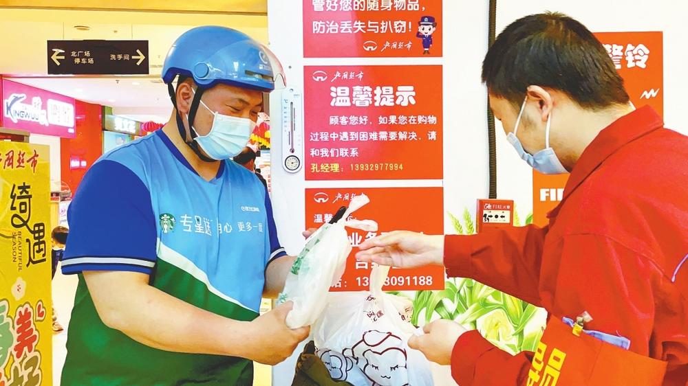 5月3日,太阳火辣,气温回升迅速。9时30分,饿了么骑手陈浩骑车赶到北国商城。在超市入口处,他经扫码测温进入超市拿到日用品后,又骑车赶往中北世纪城药店去拿药品。