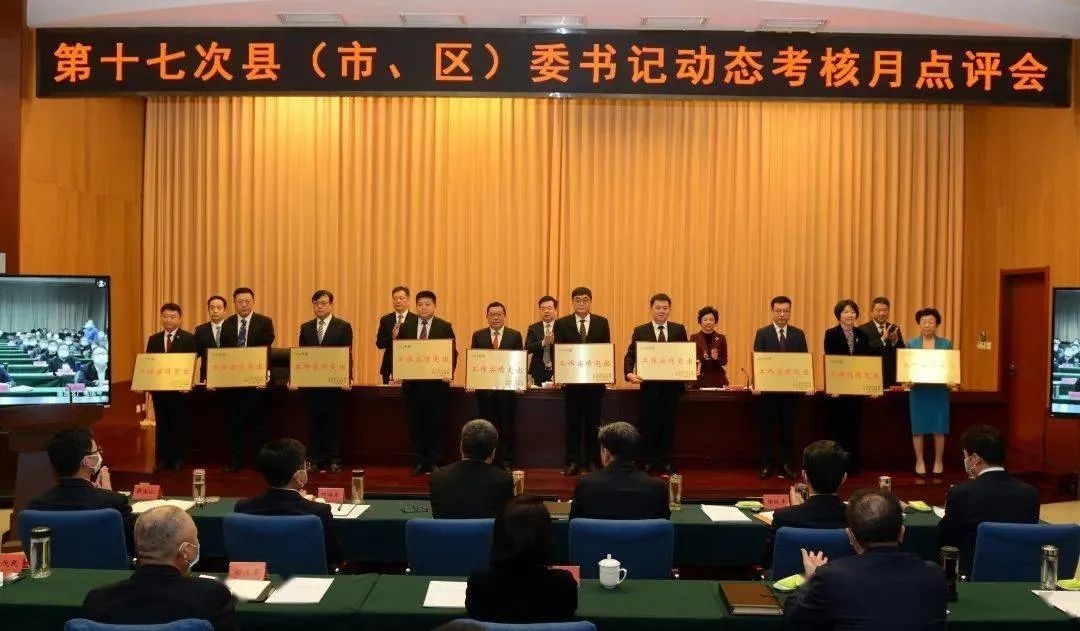 保定市举办县(市、区)委书记动态考核月点评会,考核优秀等次的县(市、区)代表和市直单位领导班子代表先后上台领奖。图片来源:保定市发改委
