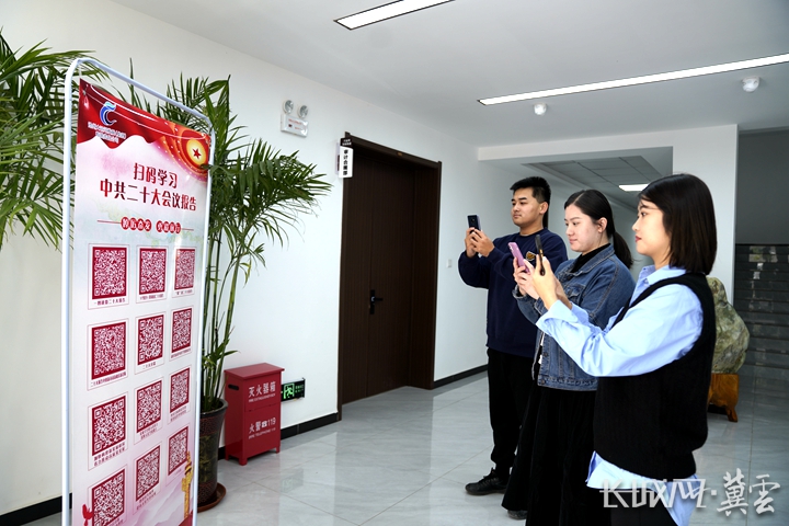 10月20日上午,在沧州大运河发展(集团)有限责任公司,记者看到每层楼的明显位置都摆放了印有“一图速览二十大报告”“‘数’读二十大报告”等二维码的易拉宝。党员干部职工纷纷来到跟前,拿出手机,自觉扫码学习。