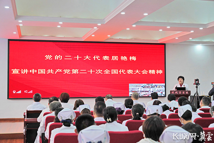 党的二十大代表,故城县医院党总支书记、院长居艳梅(右三)向医务人员宣讲党的二十大精神。牟明宏 摄