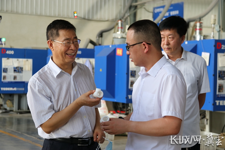 中国人民银行石家庄中心支行党委书记、行长贺同宝(左)在企业调研。