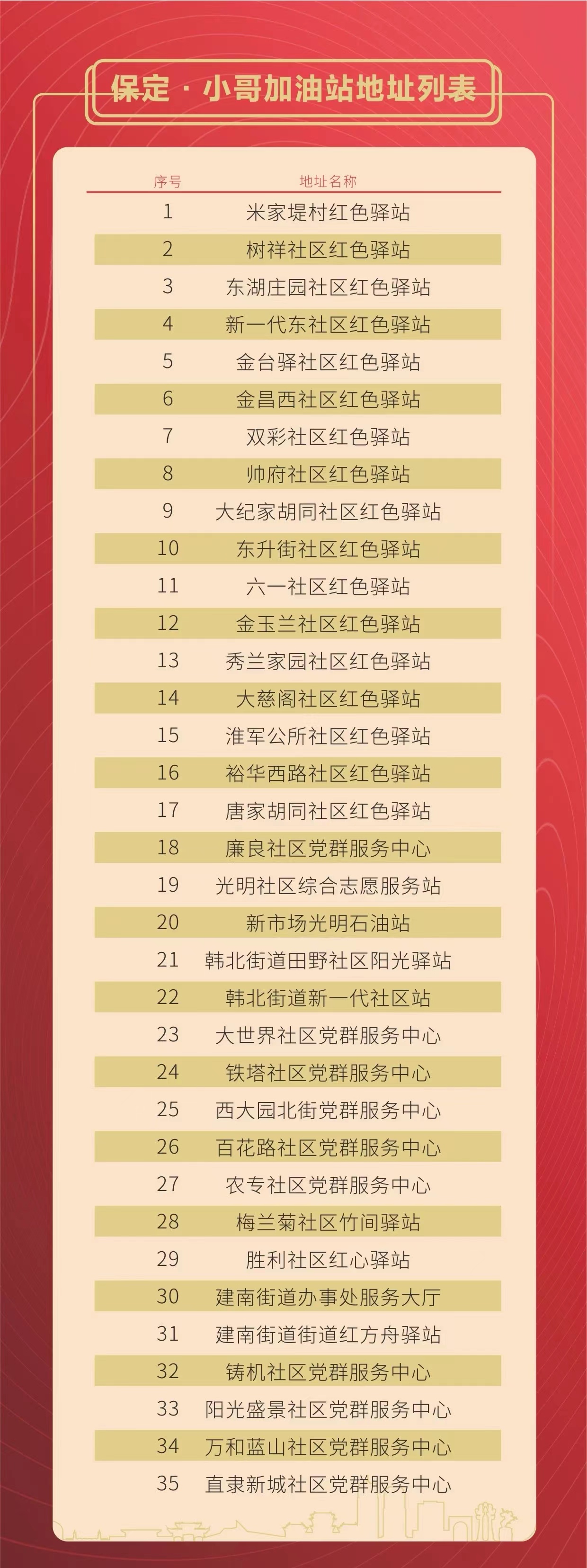 记者走进金玉兰社区看到,墙面上“保定·小哥红色加油站”标识鲜艳醒目。这里配备有饮水机、医药箱、雨伞、充电器等设施,可为快递员、外卖员以及网约车司机等长期在户外工作的人员提供热水、应急药品、手机充电、电动车充电、卫生间,乃至临时休息等相关服务。