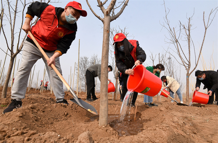 河北省邯郸市峰峰矿区和村镇,党员志愿者给种植的树木浇水。(资料片)新华社发(郝群英摄)