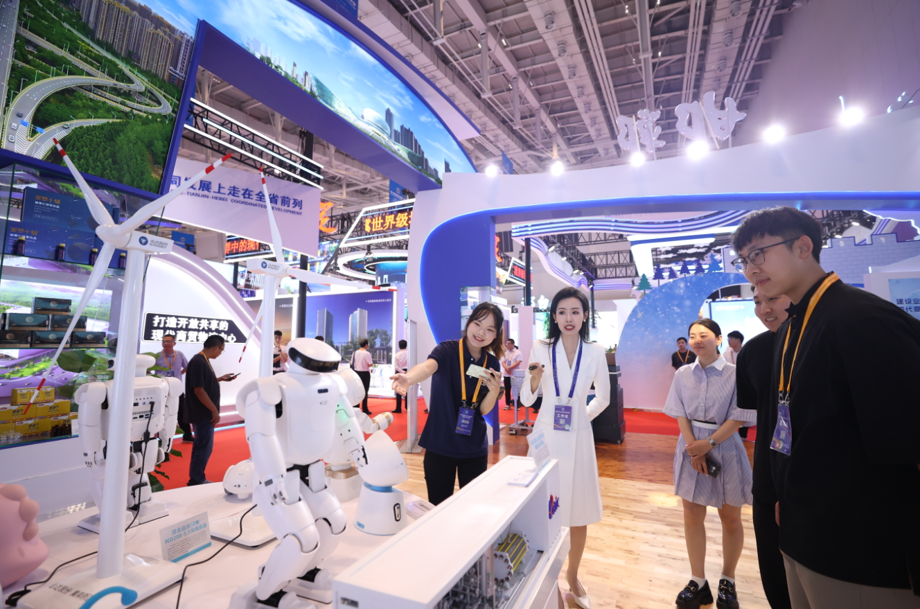 2023中国·廊坊国际经济贸易洽谈会期间,参展商向宾客介绍智能机器人。记者 贾珺 摄