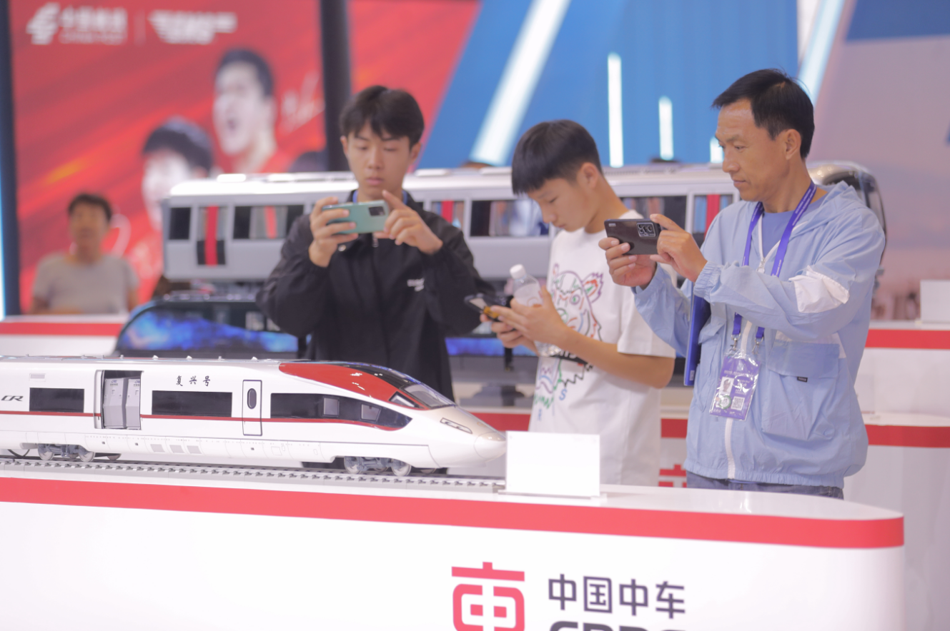 6月18日,廊坊临空国际会展中心中国式现代化河北篇章主题形象展中国中车展区内,观展游人在与各种列车拍照。记者 陈童 摄