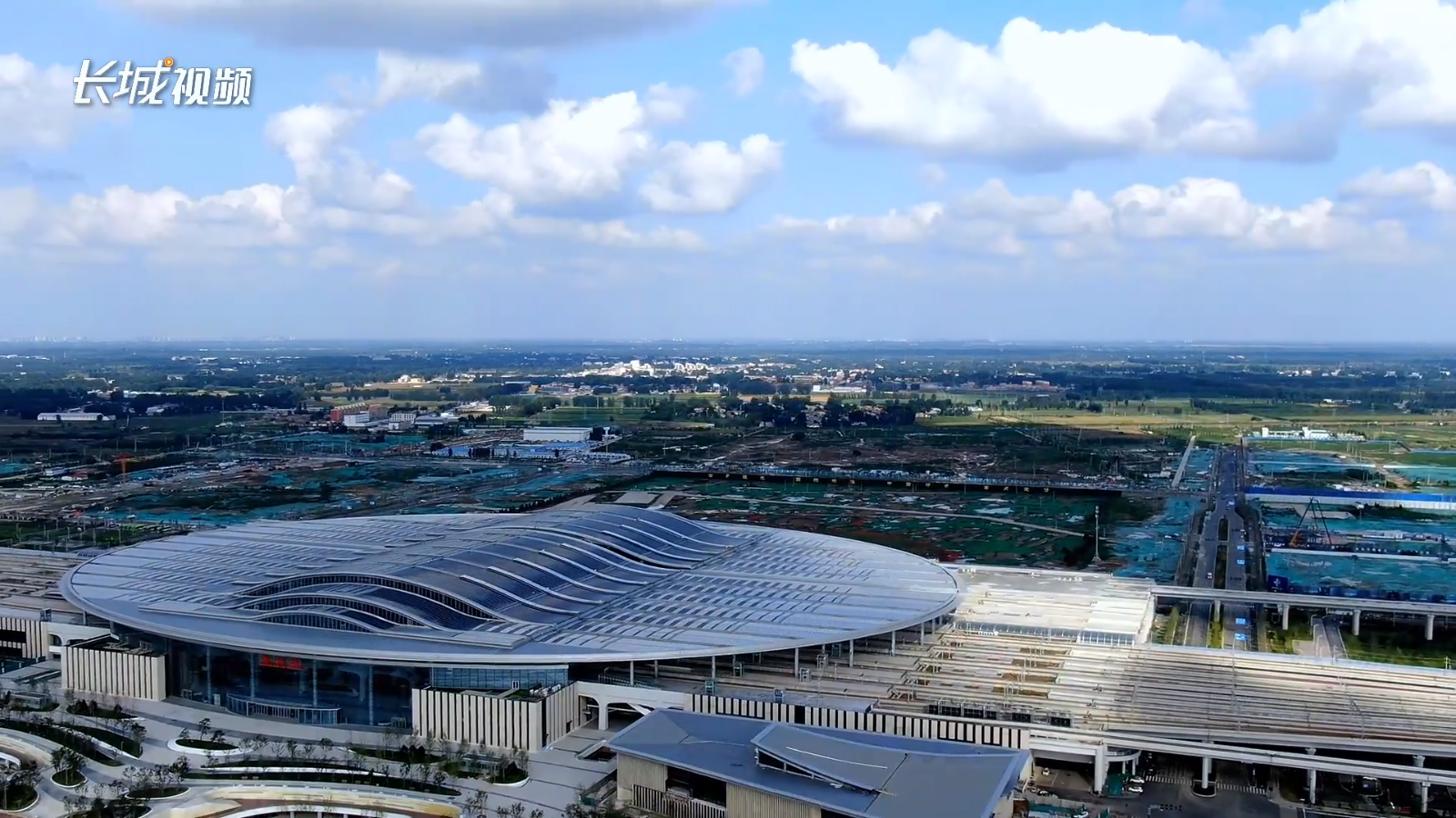 从高空俯瞰,雄安站屋盖轮廓如清泉源头,似一瓣青莲上的露珠。