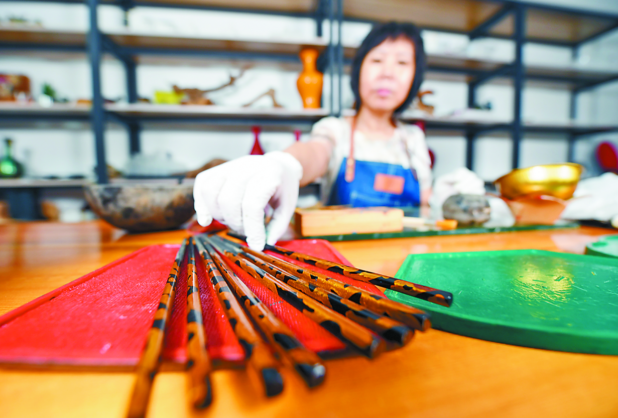 南尖塔镇南甸村省级非遗传承人许晓芳加工半成品筷子。通讯员 孙宝宇 摄
