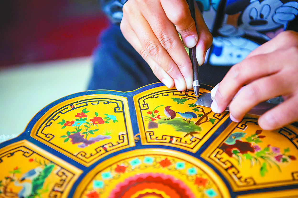 在村镇的一个小型工作室,河北省级非遗项目金漆彩绘髹饰技艺传承人刘秀娟正在仔细勾勒漆器上的图案。“作为一种古老的漆器工艺,金漆彩绘髹饰技艺是以黑、黄、红等漆胎为底色,从而展现作品的光彩。我在保持宫廷传统工艺技法和艺术风格的同时,还将中国画中的滃染、点晕、皴法等融入其中。”刘秀娟一边细致勾勒笔下的图案一边说。