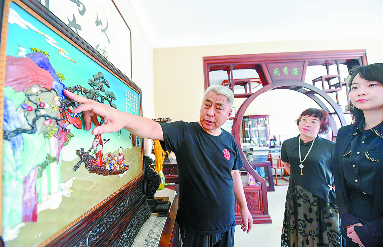 九州镇南汉村非遗传承人周洪俊为顾客介绍百宝嵌作品《麻姑献寿》制作细节。 通讯员 孙宝宇 摄