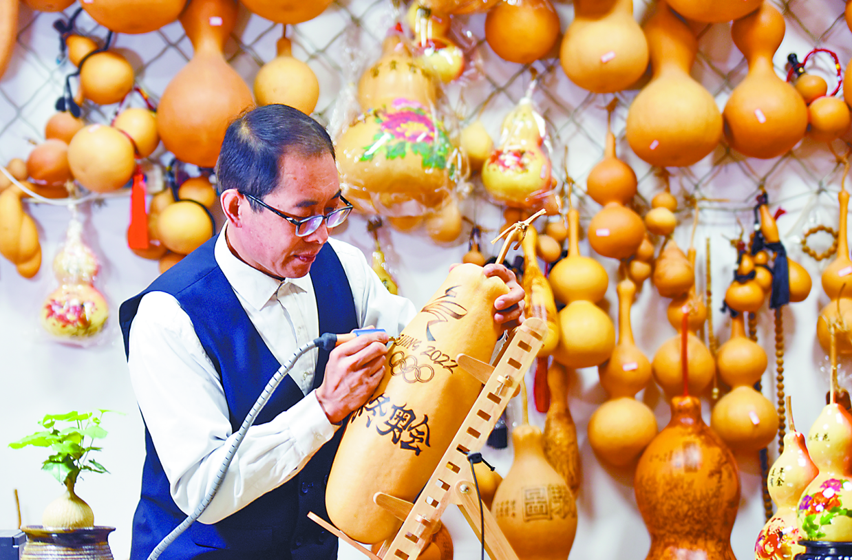廊坊市非物质文化遗产葫芦烙画传承人吴宗正制作烙画葫芦作品“魂牵冬奥”。 通讯员 孙宝宇 摄