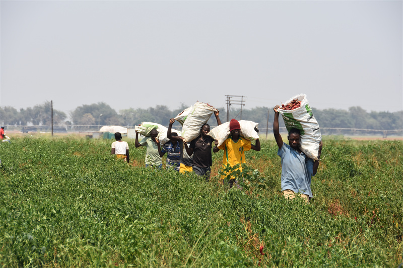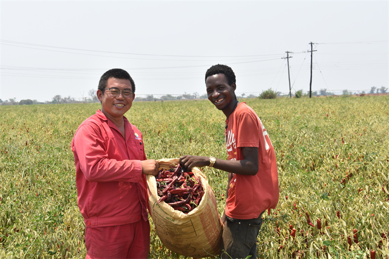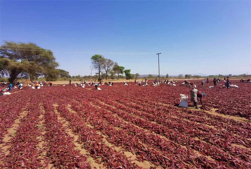 2023年10月,距离赞比亚首都卢萨卡350多公里的晨光生物赞比亚锡纳宗圭农场正值辣椒收获季。蓝天白云映衬下,当地员工和中国员工有说有笑忙着采摘,小辣椒映“红”了他们的笑脸。