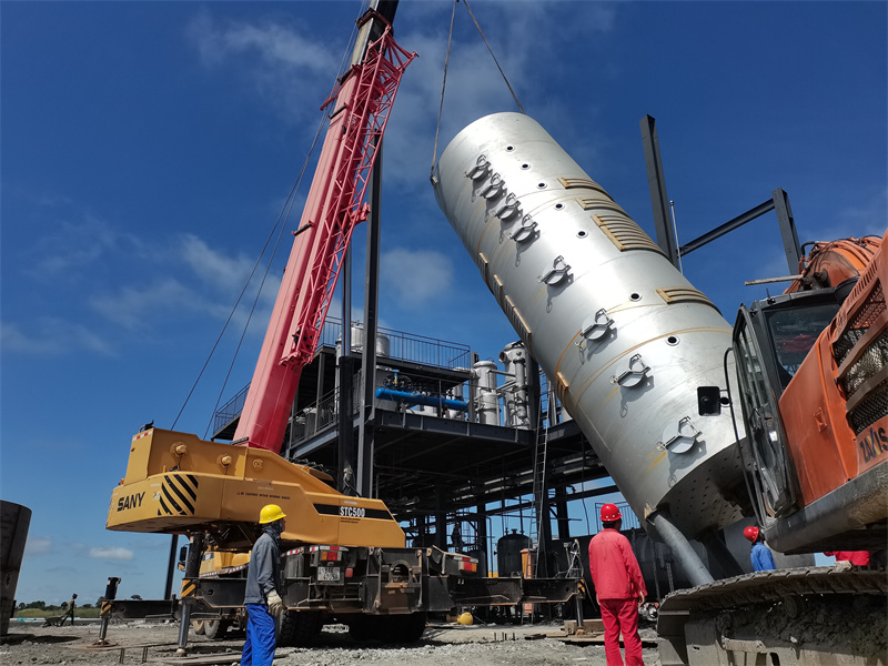 2023年,晨光生物赞比亚农业发展有限公司的提取生产线建设施工现场,工人正在吊装蒸脱机。图片由晨光生物提供