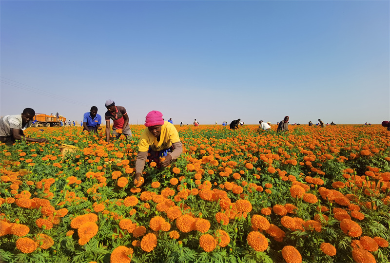 2023年7月,当地员工忙碌着对新一季的万寿菊花进行采摘。图片由晨光生物提供
