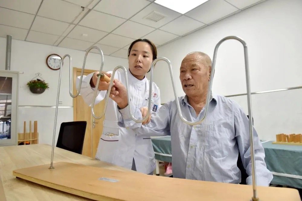 9月26日,邢台市南和区人民医院医养中心工作人员协助老人进行益智训练。新华社记者朱旭东摄。