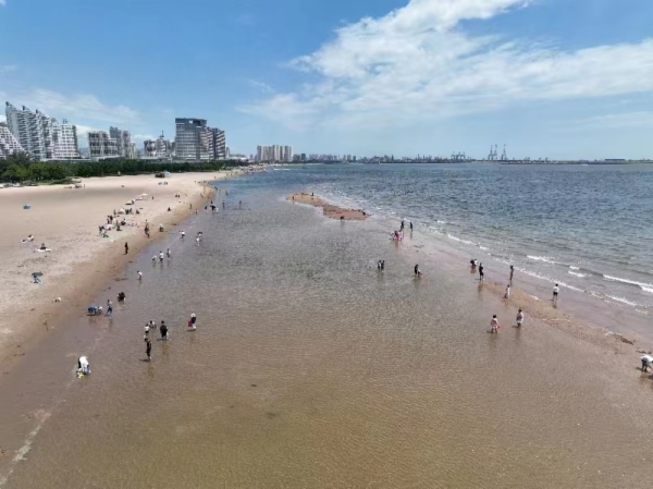 海港区金梦海湾浴场天蓝沙软潮清,吸引众多游客。