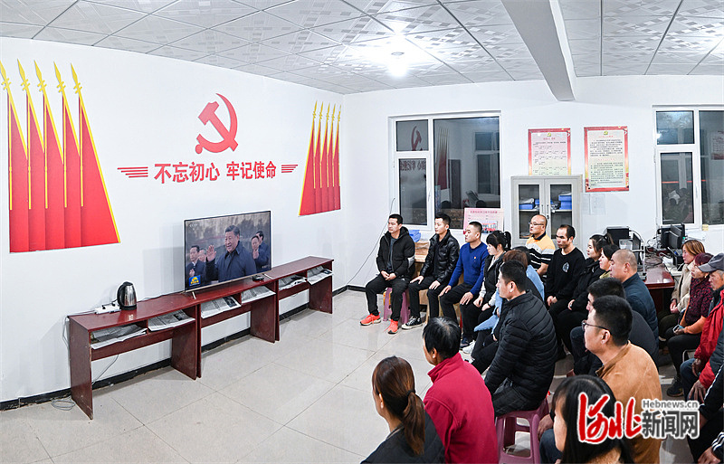 11月10日晚,涿州市刁窝镇刁四村干部群众集中收看习近平总书记在北京河北考察灾后恢复重建工作的新闻报道。河北日报记者 赵 威摄