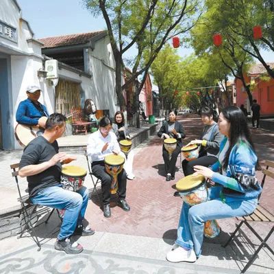 游客在周窝音乐小镇体验乐器演奏