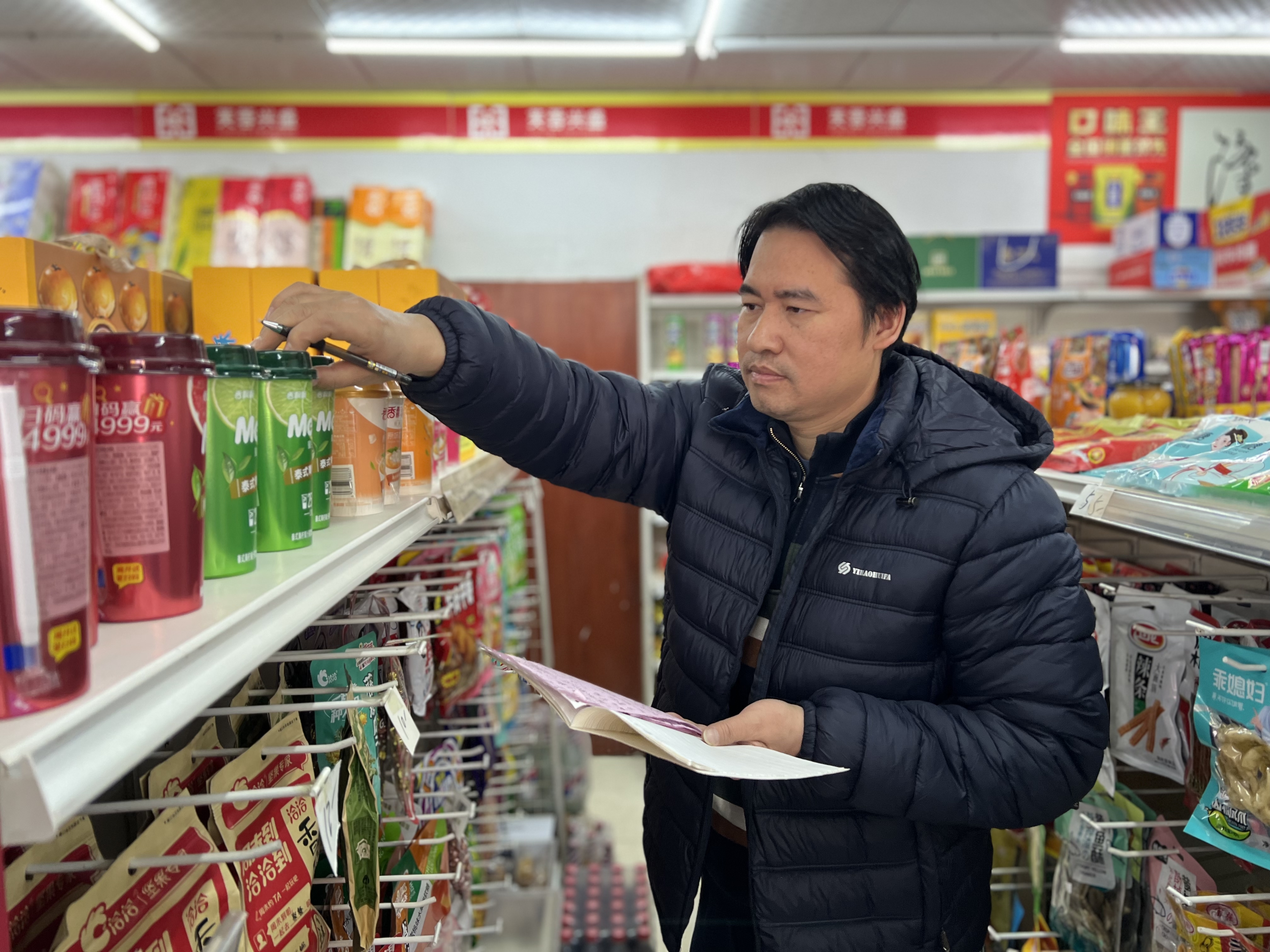 在永济秀园小区门口的超市里,经营者刘宏昌正在理货。 张洁 摄