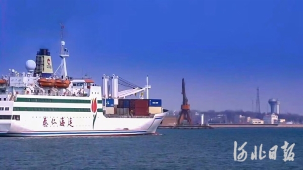 11月9日,“新郁金香”轮船在秦皇岛港集装箱码头鸣笛起航,搭载着装有家具、建材、农产品、电子产品等货物的集装箱驶向韩国仁川。