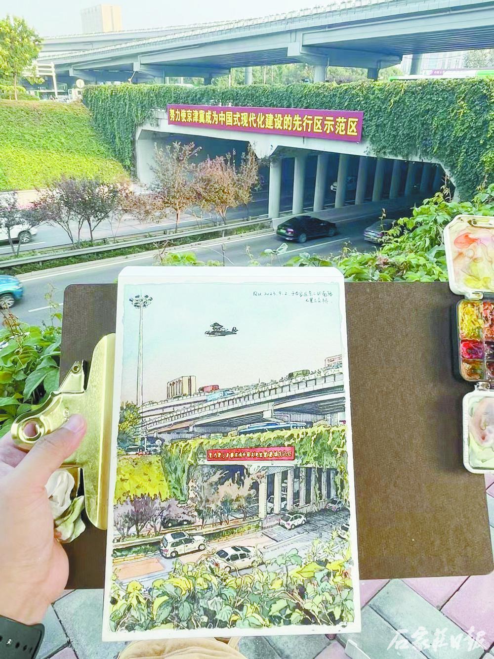 茹义松网名“炒饼写生”,籍贯河北辛集,2019年结束“北漂”生活来到石家庄。他延续着外出写生的习惯,每天背着画板行走在石家庄的大街小巷、社区庭院、公园广场。他发现,这座城市正在发生着巨变,几乎是“一天一个样儿”。尤其近两年,石家庄实施了高铁片区、太平河片区、和平东路片区等69个城市更新项目,改造提升了一千多条小街小巷,道路越修越通畅,口袋公园越建越多……在茹义松眼里,石家庄随处都有好题材,这座城市有画不尽的风景。