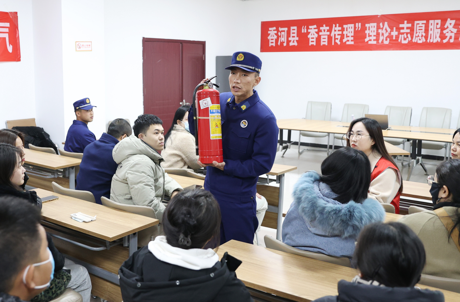 11月21日,在香河县珠光社区服务中心活动室内,志愿者正在为社区居民普及消防知识。