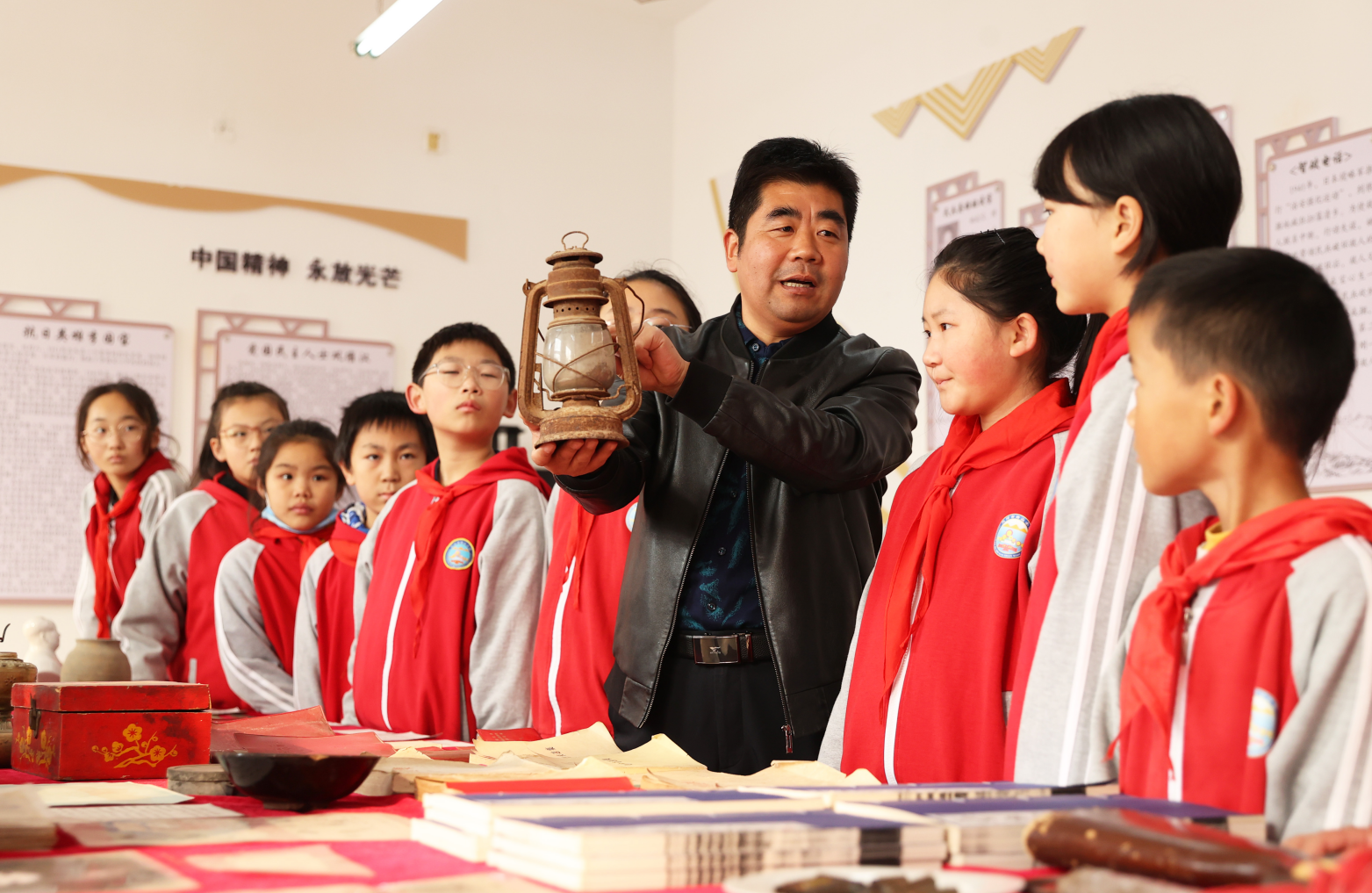 11月21日,在三河市栲山小学革命传统教育展室,校长带领“红领巾党史宣讲团”成员们参观了解历史物件。