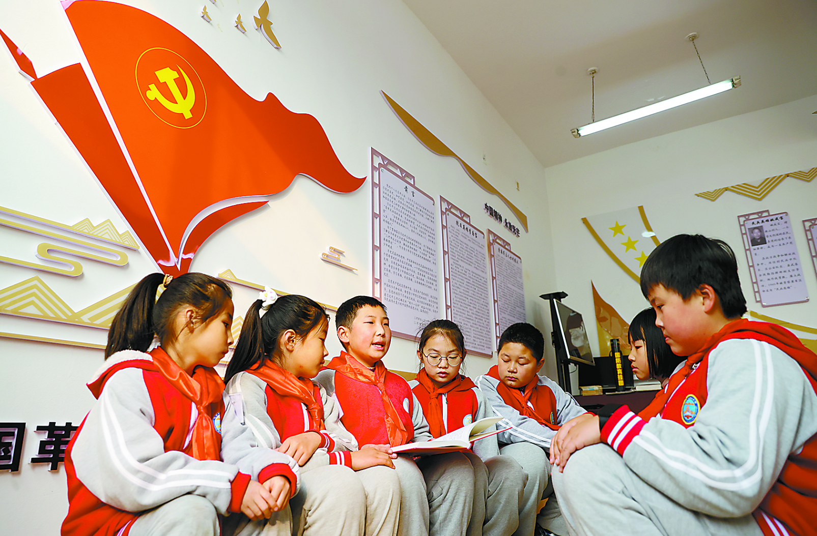 11月21日,在三河市栲山小学红色文化基地,“红领巾党史宣讲团”小成员正在讲述革命历史故事。