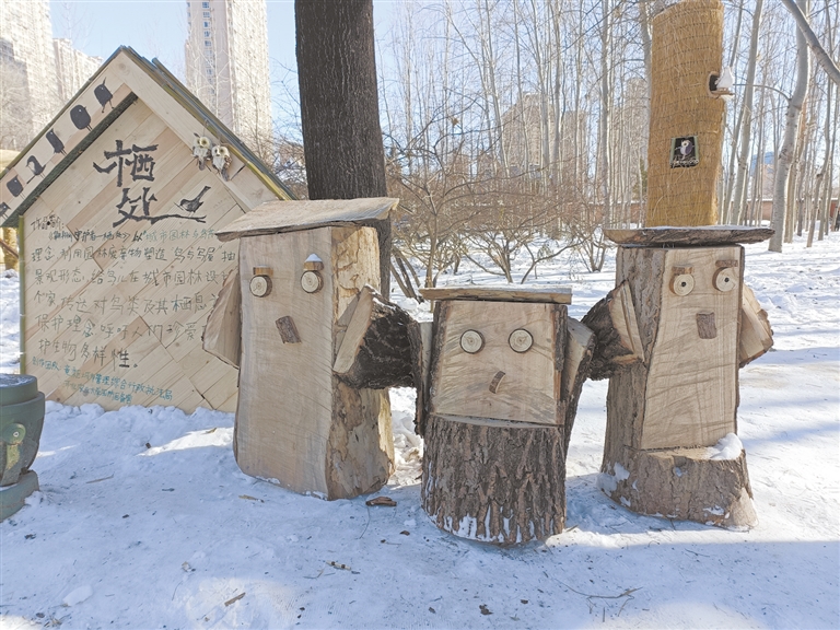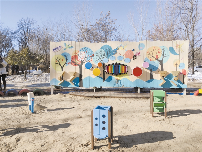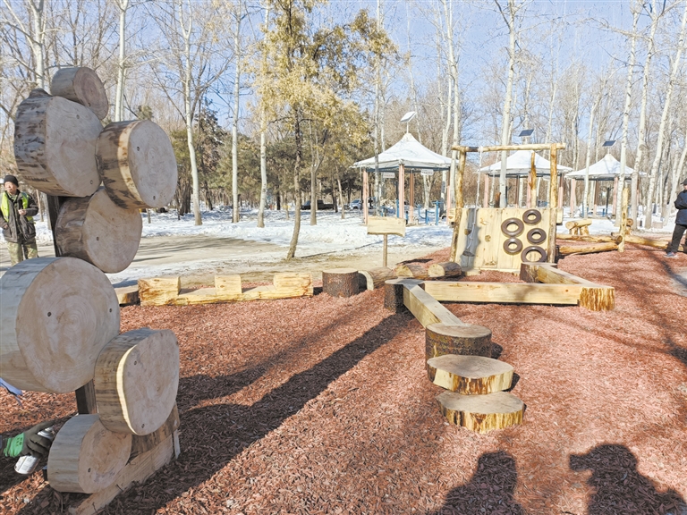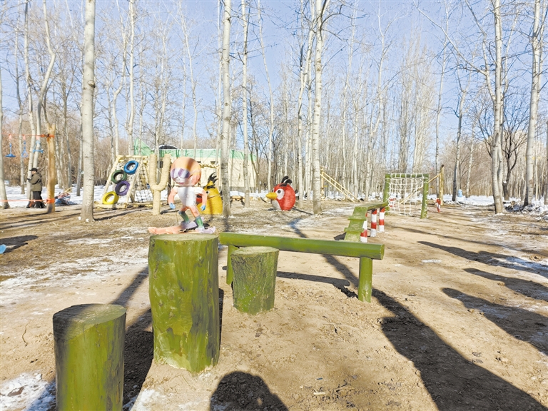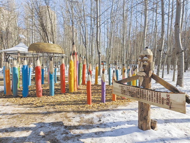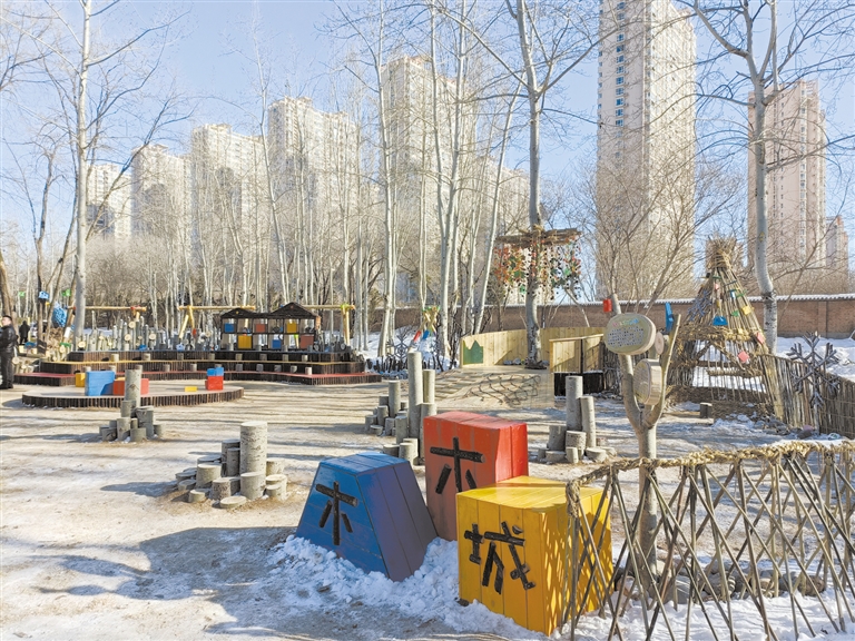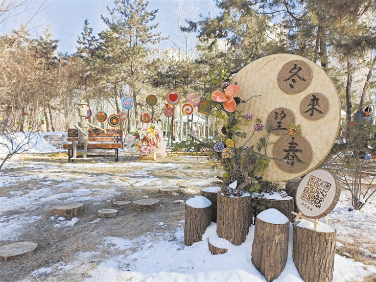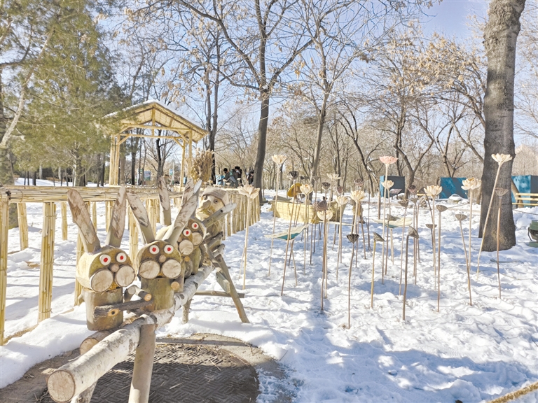 冬日的阳光倾泻在植物园东北角杨柳区附近,积雪覆盖的草坪上,一簇簇“鲜花”破土而出,一只只彩色的“蝴蝶”在空中飞舞,小朋友们跑跳在原木制作的游戏设施中,拉响了悦耳的风铃……