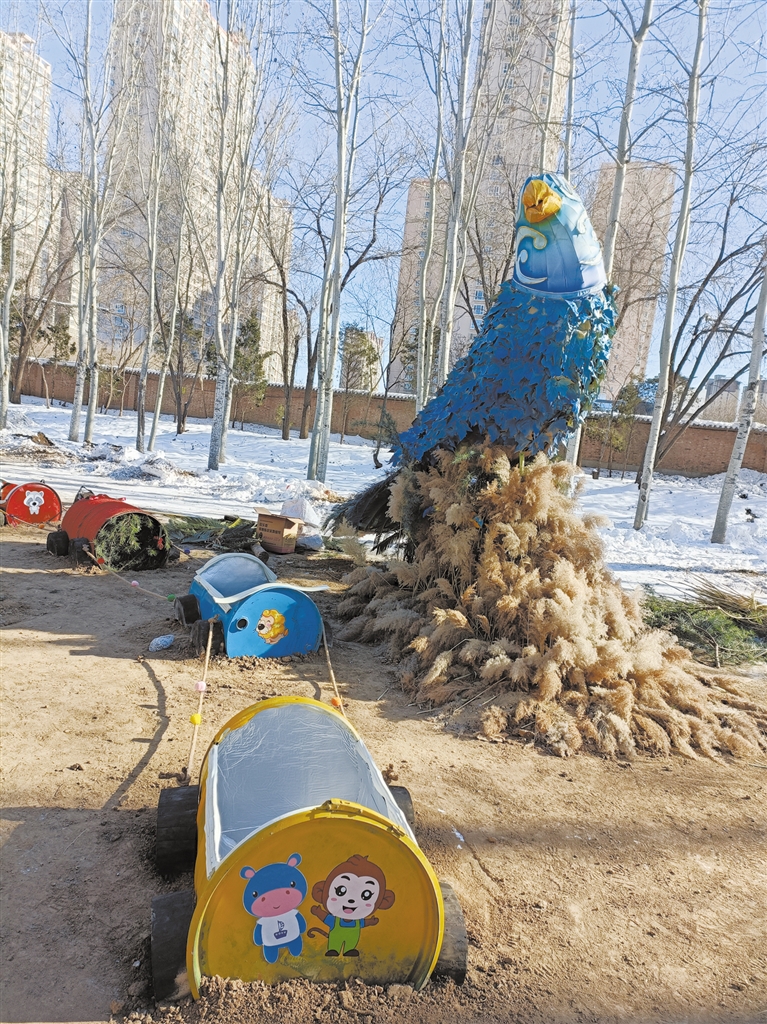 冬季的风,透骨寒。园林绿化中心机关工作人员张天昊穿得严严实实的,用戴着棉手套的手整理着树枝,上百朵“鲜花”在他们手下缓缓生长,仔细一看都是用废旧蛋托或者废弃松塔染色而成的。“我们从市区各个公园捡拾来了不少松塔,又利用废旧蛋托,制作出高低起伏破土而出的‘鲜花’。”张天昊告诉记者,他们的作品名为《冬来望春》,在这个隆冬时节,树叶、花朵渐渐凋落,但并不代表结束,它们正在为春天积蓄蓬勃的力量,孕育着一树繁华的浪漫。“这种笃行致远的力量,正是这次创新大赛的立意‘自然共生 全民共享’的深情表达。”