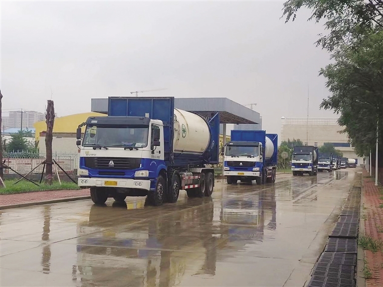 早晨开站后,环卫服务中心第一趟次生活垃圾转运车整装待发。