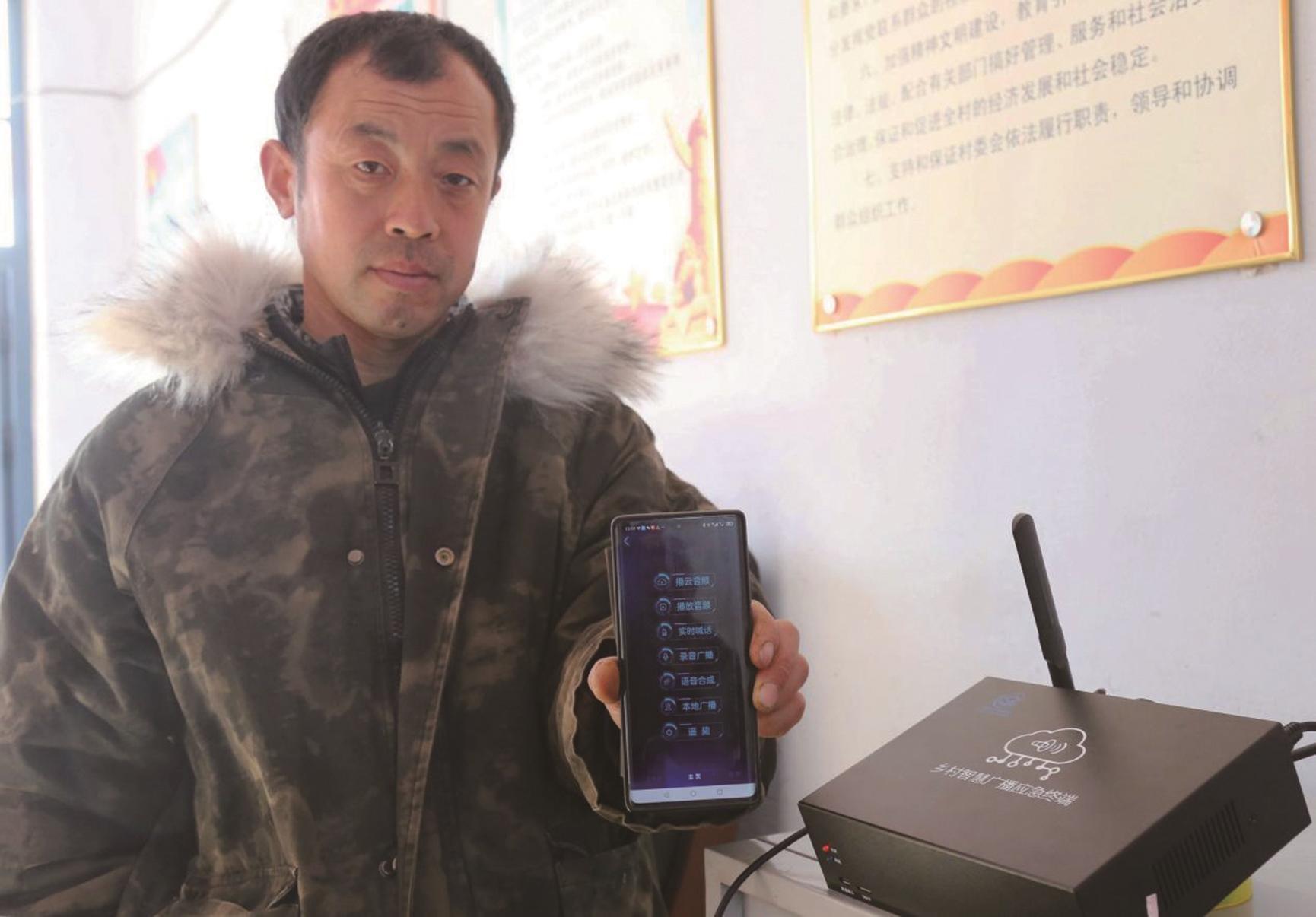 刘刚向记者展示乡村智慧应急广播终端设备。记者 刘大民 摄