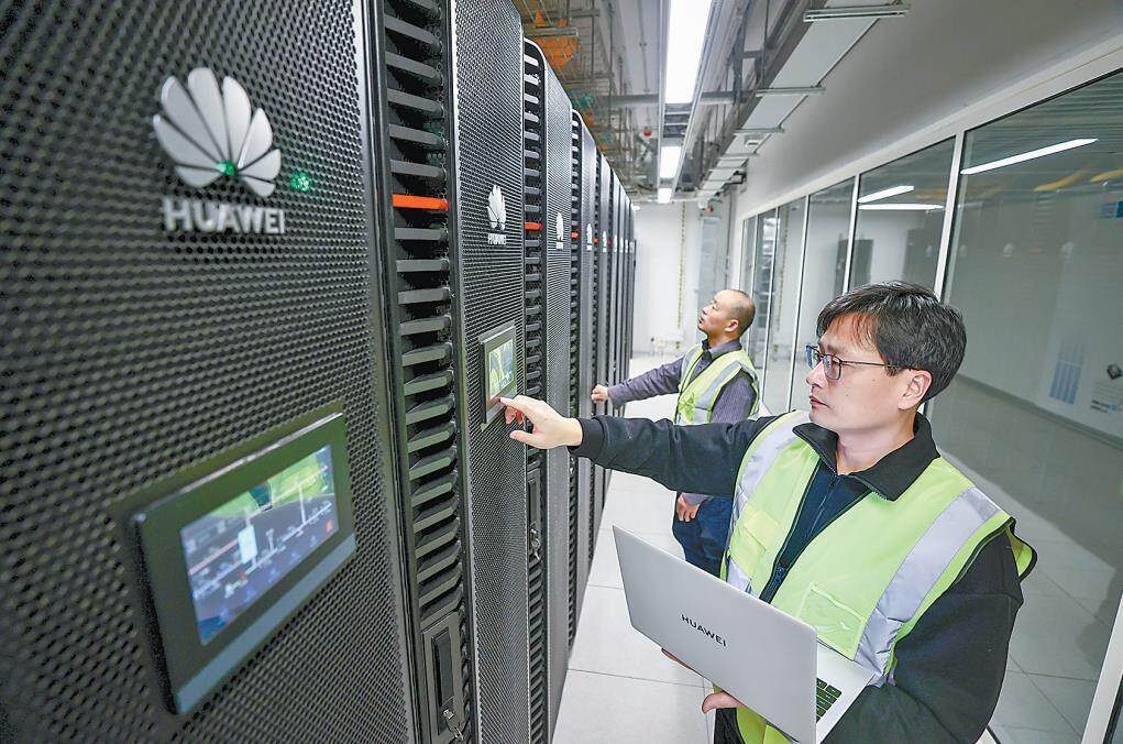 河北人工智能计算中心,工作人员在数据机房检查服务器运行状态。记者 贾珺 摄