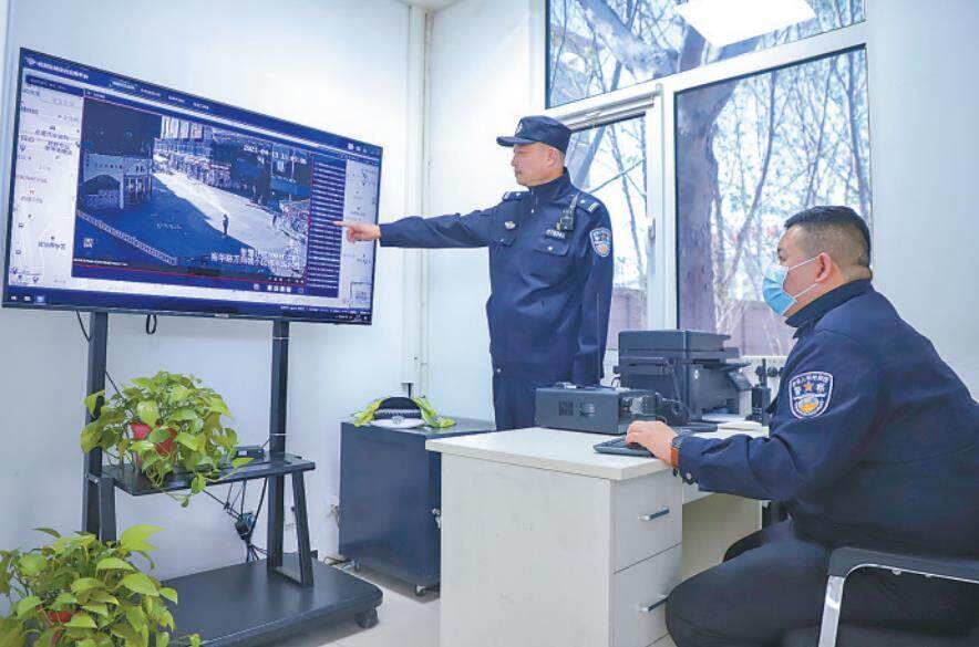 广阳道环岛警务站的辅警工作人员正在进行视频监控巡查。 记者 董旭旭 摄