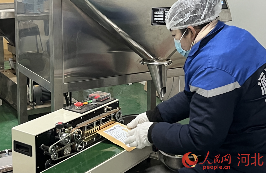 矾山派派食品有限责任公司工作人员在将杏核产品进行装袋。人民网记者 赵明妍摄