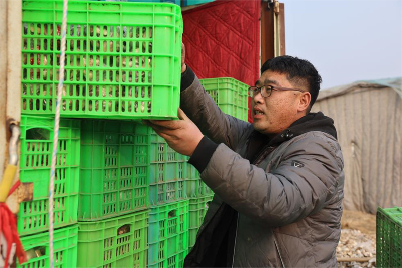 在宁晋县北河庄镇翟村瑞青食用菌种植专业合作社,工作人员将平菇装车。(张新慧 摄)